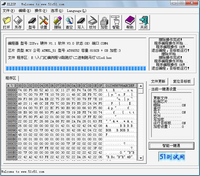 寫入,校驗,運行自動完成,軟件中英文自動選擇,適合港臺地區用戶使用。 特別設計的燒寫實驗仿真3IN1的公用卡座,